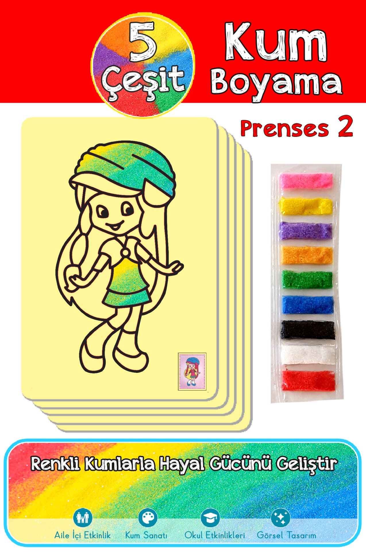 9 farklı renk kum boyama ile 5 adet yapışkanlı görselin üzeri kürdan ile açılır. yapışkanlı kağıda ulaştıktan sonra kum boyalar dökülür. Dökülen boyalar kağı da yapışır. Bu aktivite çocukların el göz koordinasyonu ve hayal dünyasını geliştirir.