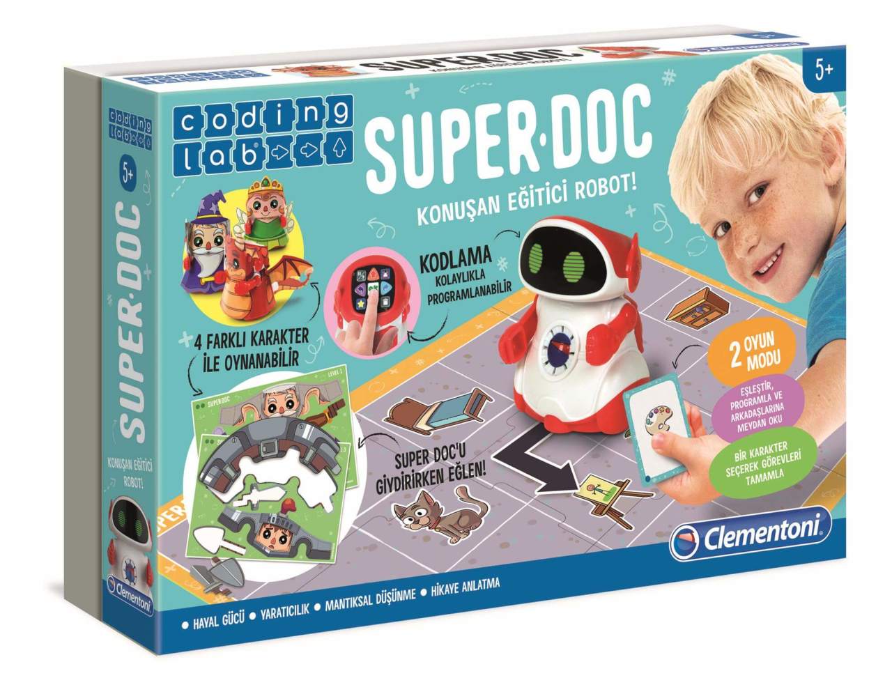Super DOC sadece bir kodlama robotu değil! Aynı zamanda çocukların hayal dünyasını renklendiren 4 farklı karaktere dönüşebilen benzersiz bir oyuncaktır. Kartondan kıyafetleri ile robot, bir ejderha, büyücü, peri veya şövalyeye dönüşebiliyor. Bu karakter değişimleri sayesinde çocuklar yalnızca mantık becerilerini değil, aynı zamanda hikâye oluşturma ve rol yapma yeteneklerini de geliştiriyor.